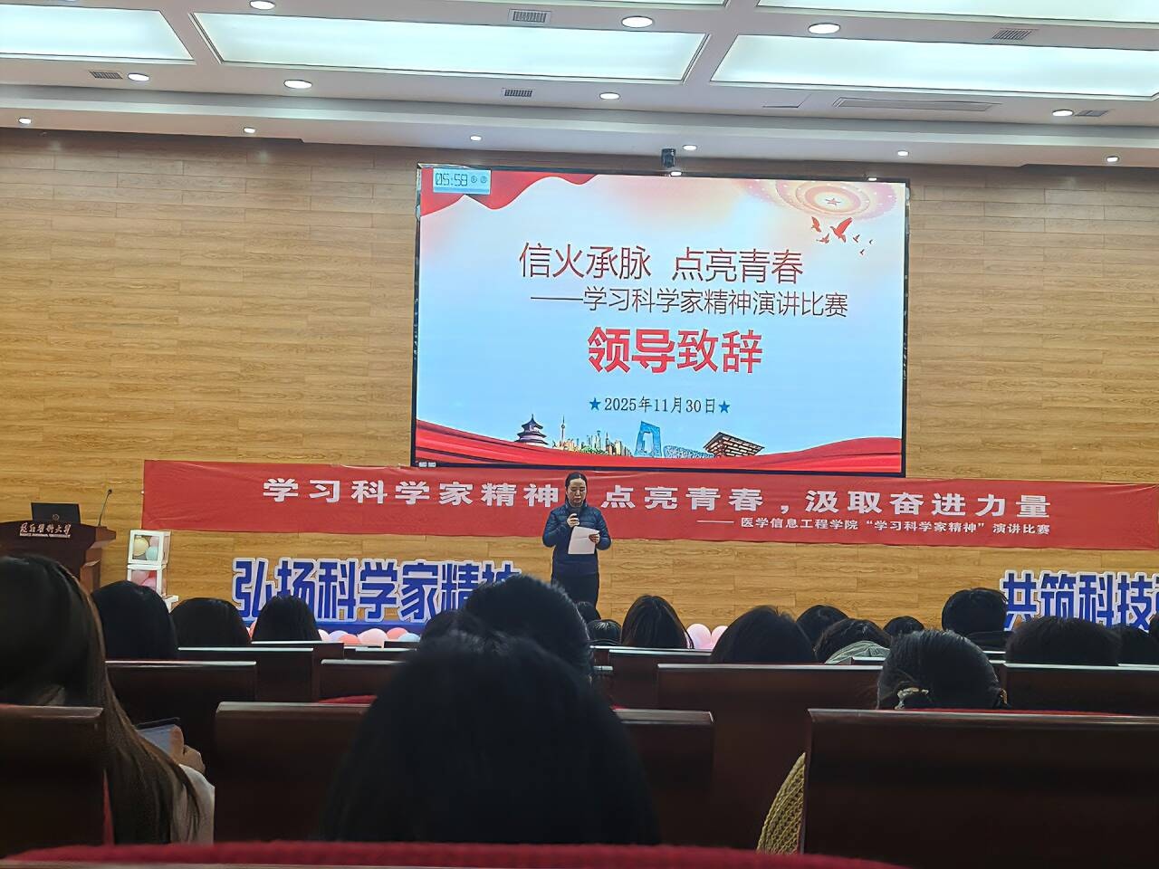 为弘扬科学家精神,传承求真务实、开拓创新的科研品格,激发青年学生崇尚科学、探索未知的热情,2025年11月30日下午15:00,3044永利集团官网于人文楼道德讲堂开展“弘扬科学家精神”主题演讲比赛。本次比赛共有10名选手参赛,全院无课同学参加,学院书记李岩、副书记刘畅以及学管办老师冉娇、刘佳俐出席本次活动。